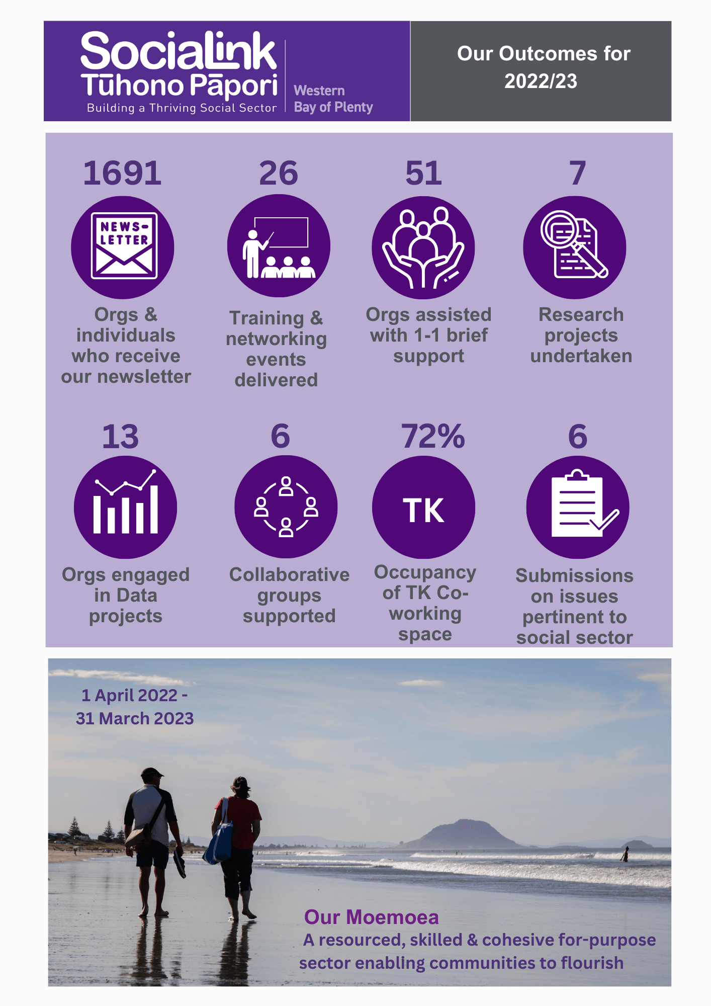 A single page infographic visually summarising your organisation’s key deliverables can be a useful resource to provide to funders, put in your annual report or add to your website.